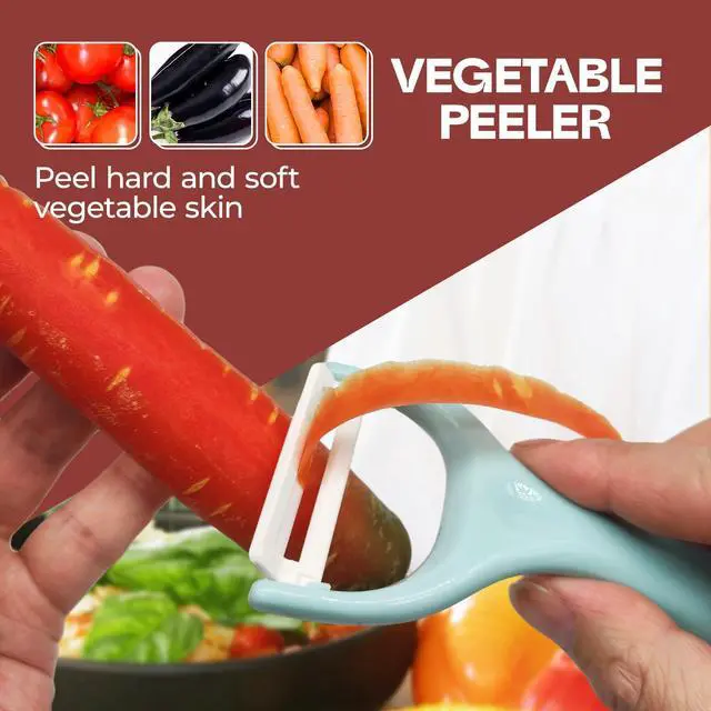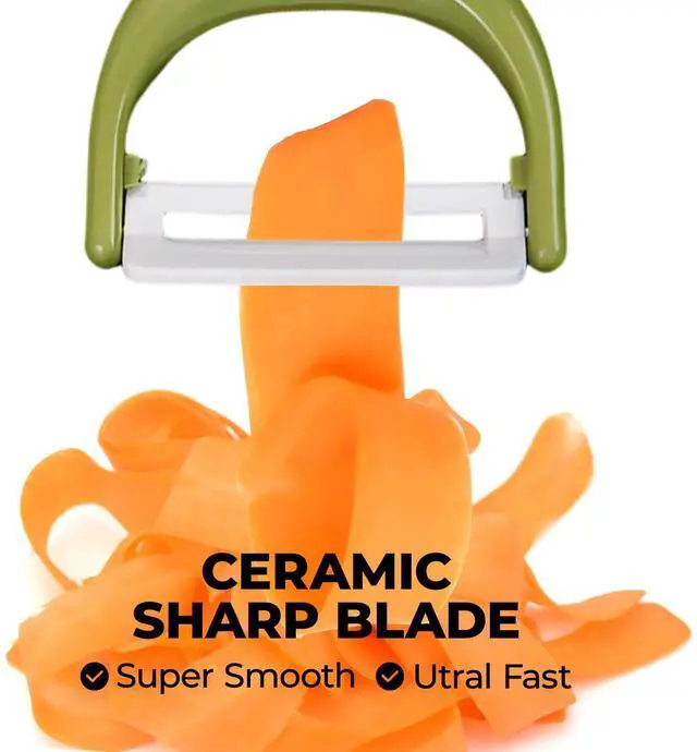 Easy Peeling & Time SavingSuper sharp ceramic peeler removes the skin effortlessly and smoothly, maintains minimal resistance and glides easily through fruits and vegetables without getting clogged by the peel, making quick work of even tougher veggies like squash.Vegetable peelers for kitchen, easily laugh off all kinds of thick and thin, hard and soft skins,safe ceramic blade, also suitable for kids.