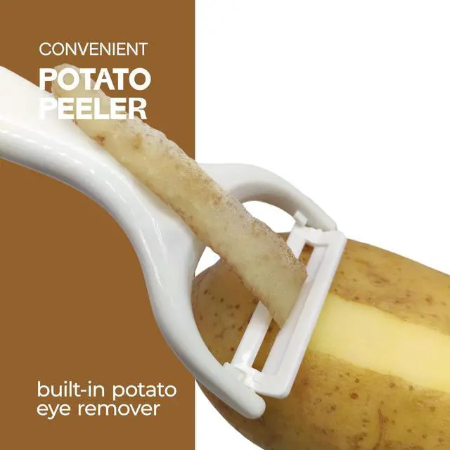 6-Pack Fruit Vegetable PeelerIt is the best Y potato peelers for apple,peaches, tomatoes, zucchini,vegetables,potatoes, cucumbers, squash, carrots, eggplant,pears.It is a high quality kitchen ceramic potato peeler, however, it may not be ideal for produce with softer skins such as oranges and corn.