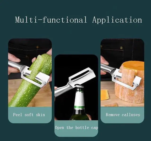 Multi-functional Design This versatile kitchen tool features a sharp blade that efficiently peels various vegetables and fruits, such as pumpkin, papaya, and zucchini. Additionally, it comes with a bottle opener, providing convenience for uncapping bottles during cooking or dining.Its ergonomic handle ensures a comfortable grip