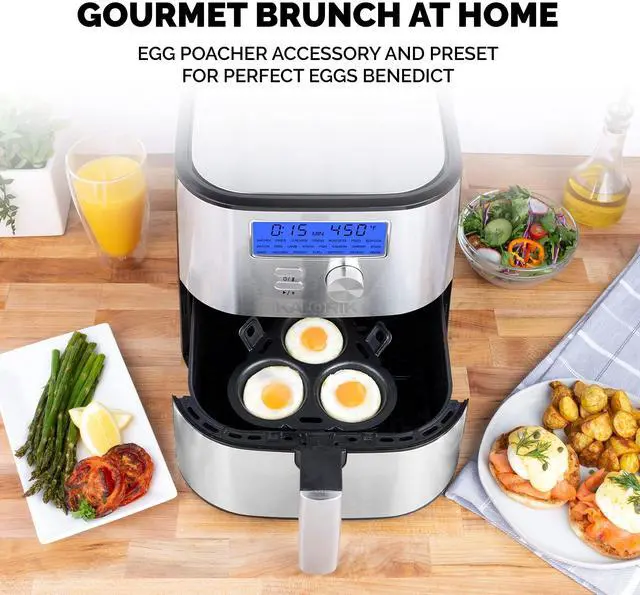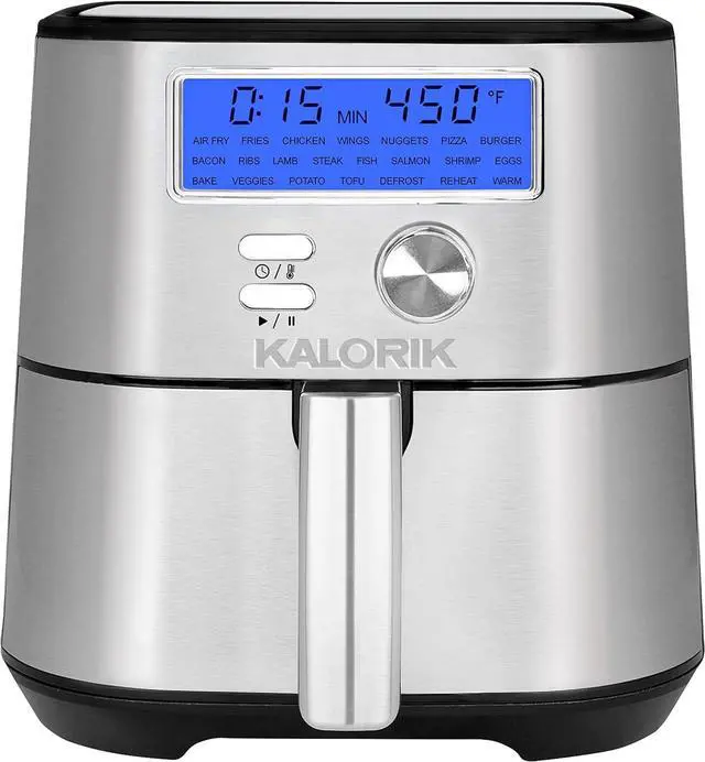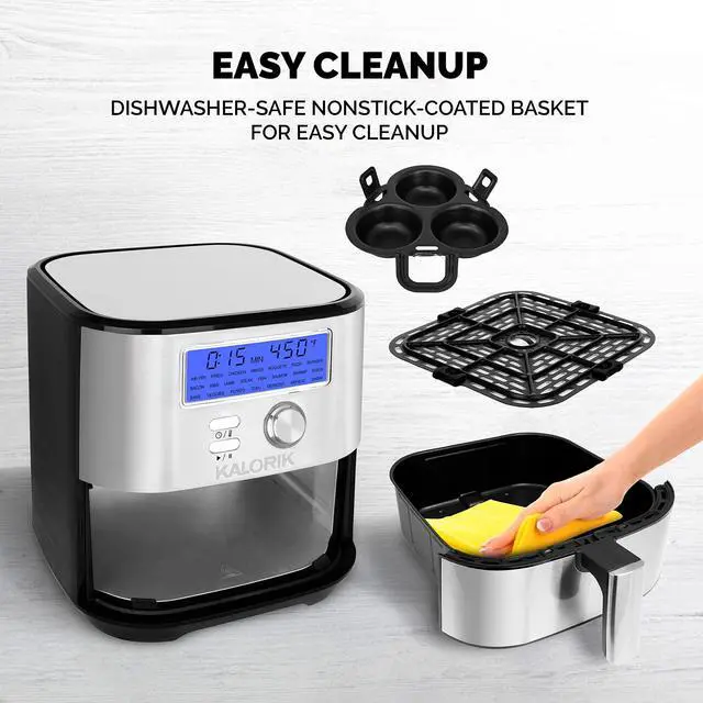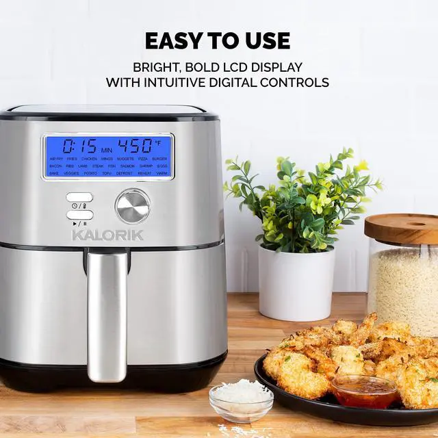 Enjoy maximum crunch and minimum calories -- the Kalorik MAXX Plus 4 Quart Digital Air Fryer delivers decadent deep-fried taste and glorious golden crunch you love, without the guilt! Best of all, it cooks food in just a fraction of the time. With its small countertop footprint, this powerful meal-making machine offers endless cooking possibilities, allowing you to fry, bake, roast, broil, defrost, reheat, poach, and warm meals at the touch of a button.