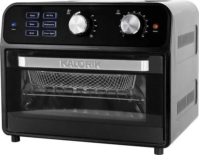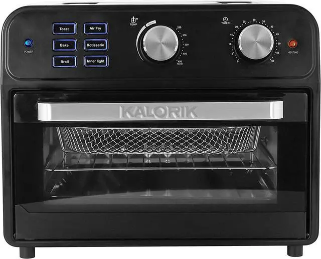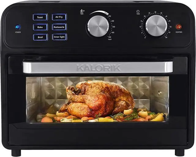 Fry, bake, roast, toast, and broil with the Kalorik 22 Quart Digital Air Fryer Oven. This innovative and multifunctional appliance uses Rapid Hot Air Technology to cook food faster, and make meals healthier. The air frying mechanism works by circulating super hot air around your food, delivering the same crispy texture and rich flavor of your favorite fried foods? -- without the need for oil. That means less fat and calories. The Kalorik 22 Quart Digital Air Fryer Oven not only functions as an air fryer, it can even be used as your regular, everyday toaster/convection oven.