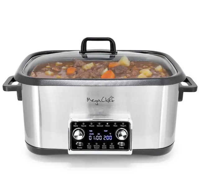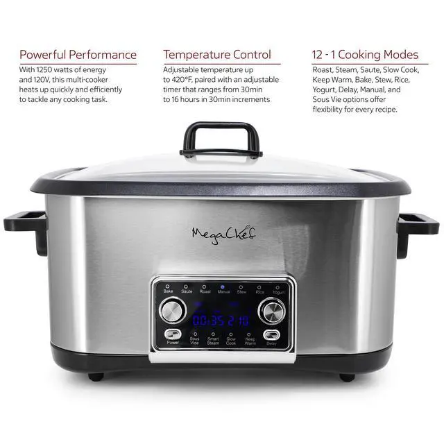 Introducing the MegaChef 8 Quart 12-in-1 Deluxe Multi Cooker with Sous Vide-the ultimate kitchen appliance that revolutionizes home cooking. This versatile multi cooker combines the functions of multiple kitchen devices into one sleek unit, making meal preparation faster and easier than ever. With an impressive 8-quart capacity and powerful 1250 watts of heating power, it's perfect for everything from family dinners to meal prepping.