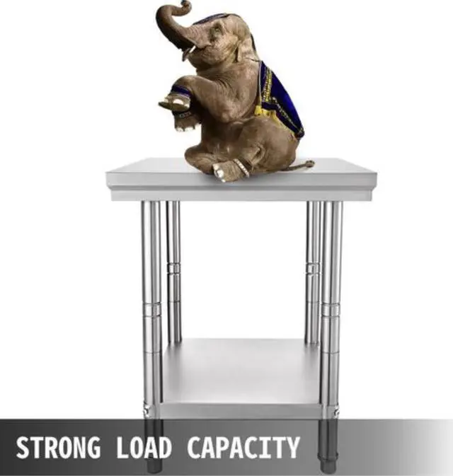 Under Shelf Load Capacity: 110 lbs / 50 kg,Under Shelf Dimension: 18.1 x 18.1 x 1.6 in / 46 x 46 x 4 cm,Item Dimension: 23.6 x 23.6 x 31.5 in / 60 x 60 x 80 cm,Material: Stainless Steel,Distance Between Two Shelf: 17.3-20.5-23.6 in / 44-52-60 cm,Upper Shelf Load Capacity: 220 lbs / 100 kg,Table Legs Thickness: 0.02 in / 0.06 cm,Upper Shelf Dimension: 23.6 x 23.6 x 3 in / 60 x 60 x 7.5 cm,Adjustable Foot Height: 0-0.4 in / 0-1 cm,Item Weight: 18.7 lbs / 8.5 kg,Table Legs Diameter: 1.9 in / 4.8 cm