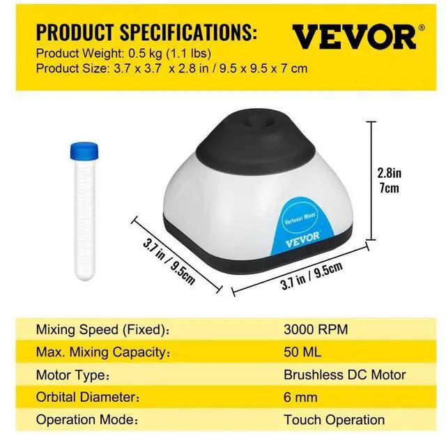 Size: 3.7" x 3.7" x 2.8" / 9.5 x 9.5 x 7 cm,Material: PC Plastic + Silicone,Certification: CE, FCC, and RoHS Approved,Weight: 1.1 lbs / 0.5 kg,Operation Mode: Touch Operation,Permissible Ambient Temperature: 41°F-104°F / 5-40,Permissible Relative Humidity: 80%,Mixing Speed: 3000RPM (Fixed),Max. Mixing Capacity: 50mL,Type of Movement: Orbital,Voltage: 110V,Motor Type: Brushless DC Motor,Model: KW-3000-1H,Motor Power: 4W,Orbital Diameter: 6 mm