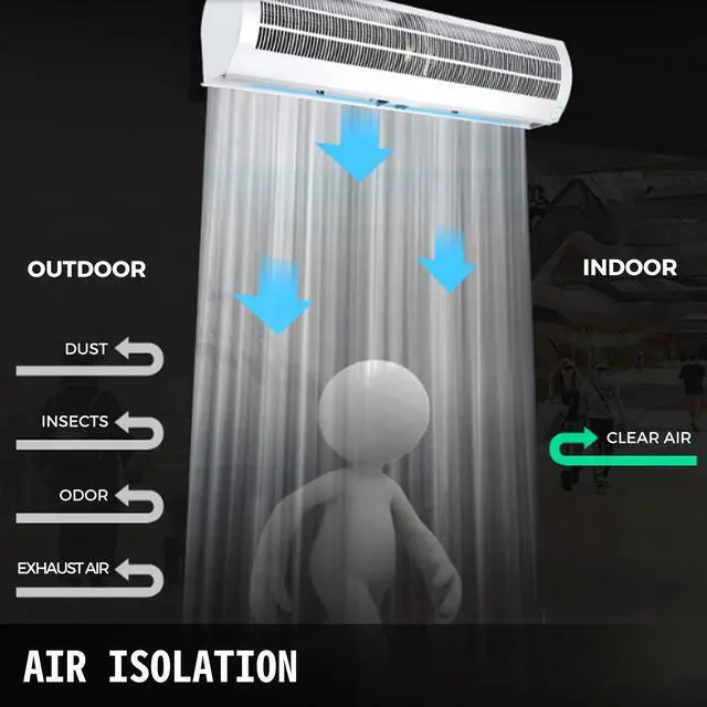 • ISOLATE INTERIOR FROM EXTERIOR- The commercial air curtain, made of galvanized material+powder coat or Aluminum alloy+powder coat, effectively keeps the conditioned air inside and blocks 90% of hot/cold air, dust, flying insects, etc.