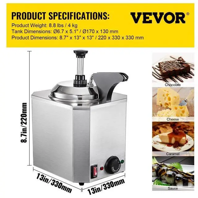 Temperature: 30-110 (86-230),Capacity: 2.5L (0.66 gal),Voltage:110V,Color:Silver,Product Dimensions (without pump): 8.7"x13.4"x12.8" (220x340x325mm),Material:Stainless Steel,Production Per Time: 10-30 ml,Tank Dimensions: 6"*5.3" (150*135mm),Application: nacho cheese, hot fudge, caramel, chili, curry, sauces,Power: 650W