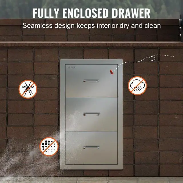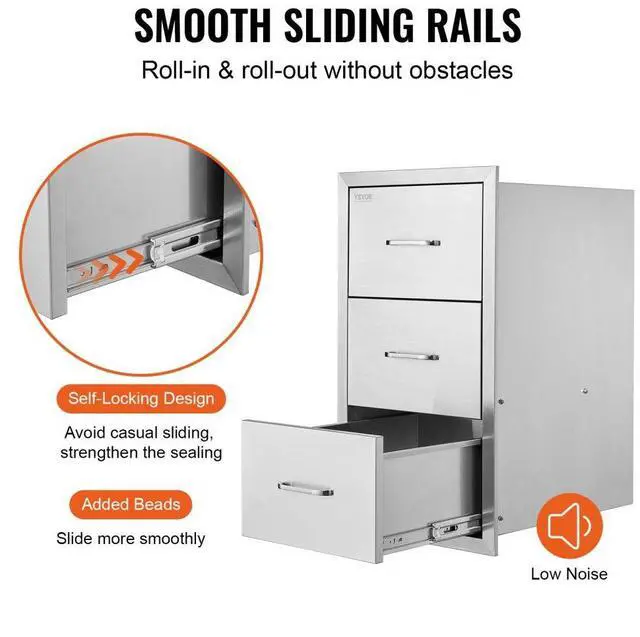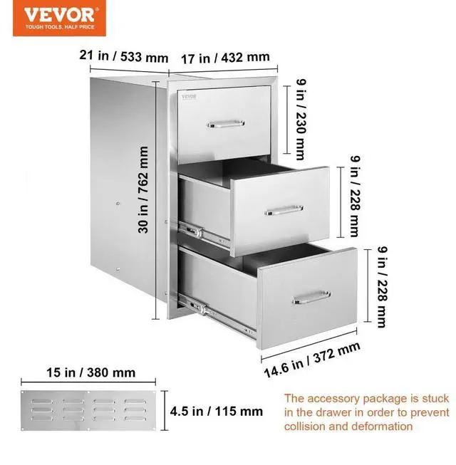 Cutout Size: 15 x 28 x 21 inch (W x H x D),Type: Triple Drawers,Material: Food-grade stainless steel,Overall Size: 17 x 30 x 21 inch (W x H x D),Item Weight: 56 lb