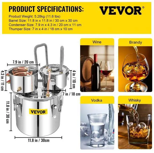 Boiler Barrel Capacity: 5 Gal / 19 L,Copper Coil Diameter: 0.39" / 10 mm,Boiler Barrel Size: 11.8" x 11.8" / 30x30 cm,Thumper Keg Size: 7" x 4" / 18x10 cm,Condenser Keg Size: 7.9"x4.3" / 20x11 cm,Barrel Thickness: 0.03" / 0.7 mm,Product Weight: 11.6 lbs / 5.28 kg,Material: Stainless Steel + Red Copper,Condenser Keg Capacity: 0.92 Gal / 3.5 L