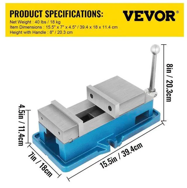 Jaw material: 45# steel,Type: Bench Vise,Jaw opening: 5" (125 mm),Jaw height: 1.6" (40 mm),Gross weight: 40 lbs (18 kg),Wrench material: QT500 ductile iron,Jaw width: 5" (125 mm),Body material: HT250 gray cast iron,Vise Height: 4.3" (110 mm),Max Clamping force: 24 KN,Package dimensions (L x W x H): 16" x 11" x 6" (41 x 27 x 15 cm)