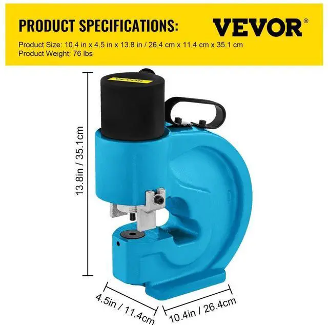 • Aperture(4 pairs): 3/8"(10.5 mm), 1/2"(13.8 mm), 5/8"(17.5 mm), 3/4"(20.5 mm),Depth of Throat: 4.3",Punching Force:350KN(35T),Max. Thickness of Aluminum: 1/10-1/2 inch,Max. Thickness of Stainless Steel: 1/10-3/10 inch,Max. Thickness of Iron Plate: 1/10-2/5 inch,Max. Thickness of Copper Bar: 1/10-1/2 inch