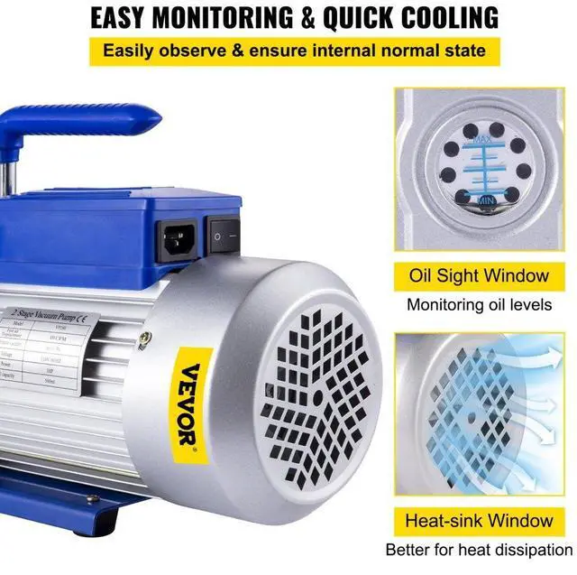 Pump rotating speed: 2000 r/min,Type: 2-stage vacuum pump,Suitable for all refrigerants: R12, R134a, R22, R410a, R404, R502 etc,Note: Oil are not included,Power/voltage: 1HP, 110V/50-60HZ,Ultimate vacuum: 3x10-1Pa, 25 microns,Free air displacement: 12 CFM, 254 L/M,Oil capacity of Pump: 600 ml