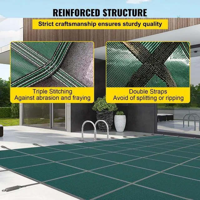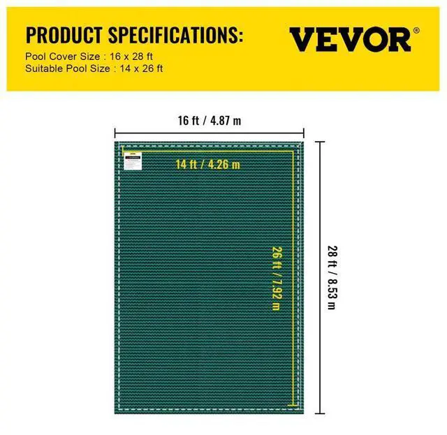 Ground Bolt: Brass,Gross Weight: 39.8 lb/18.1 kg,Tension Spring: 304 stainless steel,Swimming Pool Size: 14 x 26 ft/4.3 x 7.9 m,Color: Green,Model: SSPC-8623,Swimming Pool Cover Size: 16 x 28 ft/4.9 x 8.5 m,Material: Polypropylene,Surface: Tight Mesh,Package Size: 28.3 x 19.7 x 19.7 in/72 x 50 x 50 cm