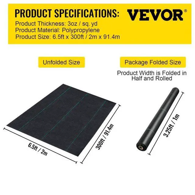 Gross weight: 46.0 lb / 20.9 kg,Color: Black,Size(L x W): 300 x 6.5 ft,Package size: 79.9 x 7.9 x 7.5 in,Material: Polypropylene fabric,Density: 12,Weight: 3.0oz/sq.yd