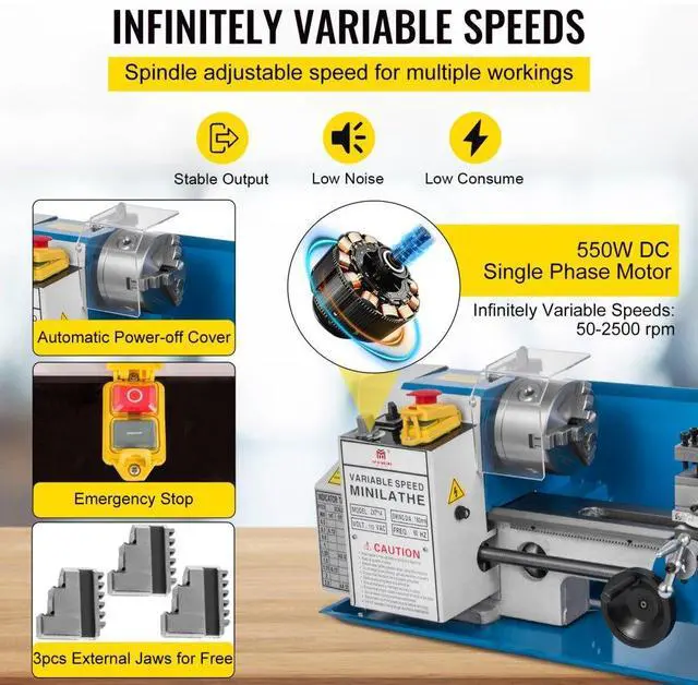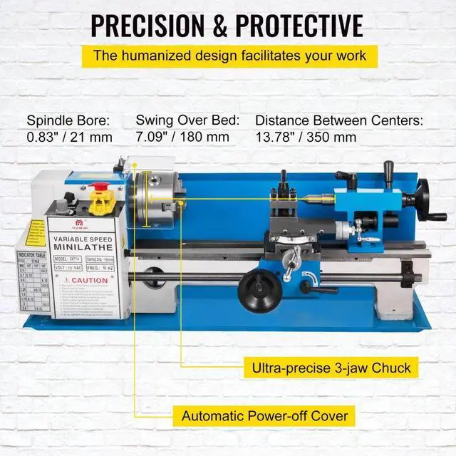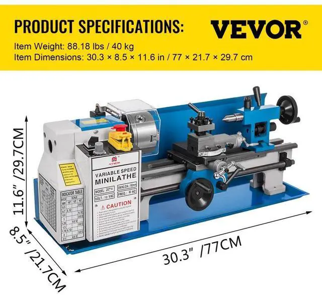 Inch Thread: 12-52 T.P.I,Spindle Bore: 0.82" / 21 mm,Variable Speed: 50-2500PRM,Centers Distance: 13.78" / 350 mm,Chuck Diameter: 3.94" / 100 mm,Item Dimensions: 27.5 8.5 11.6 in / 69.9 21.7 29.7 cm,Metric Thread: 0.5-2.5 mm,Power of Motor: 550W DC Single Phase,Item Weight: 88.18 lbs / 40 kg,Swing Over Bed: 7.09" / 180 mm