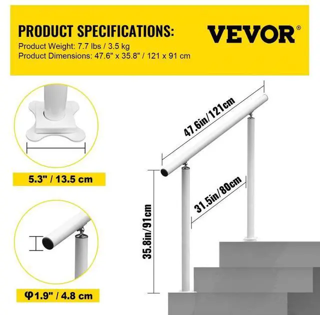 Steps: 1 to 4,Pre-Drilled Hole Diameter: 0.5"/13 mm,Color: White,Base Thickness: 0.2"/5 mm,Material: Aluminum & Iron,Product Size (W x H): 47.6" x 35.8"/121 x 91 cm,Distance Between Vertical Bars: 31.5"/80 cm,Tube Thickness: 0.08"/2 mm,Load Capacity: 165 lbs/75 kg,Base Size (L x W): 5.3" x 5.3"/13.5 x 13.5 cm,Model: LZBS-4FT,Product Weight: 7.7 lbs/3.5 kg,Adjustable Angle: 0-45,Tube Diameter: 1.9"/4.8 cm