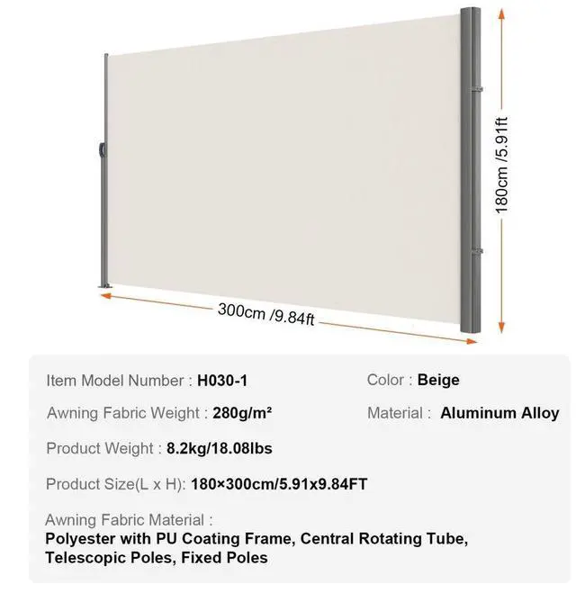 Frame: Aluminum alloy +Polyester Cloth,Screen: 280g/m polyester fabric(PU coating),Color: Creamy-white,Dimension: 71x118inch(180X300cm),Weight: 22.4lbs/10.2 kg,Handle: Retractable