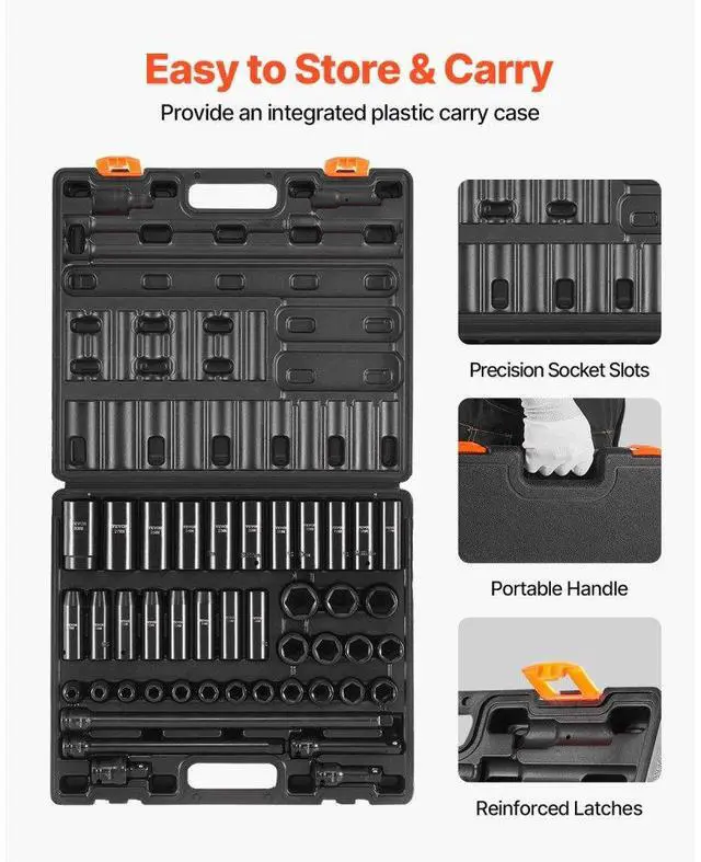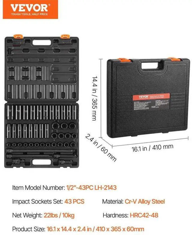 Deep Sockets: 9mm, 10mm, 11mm, 12mm, 13mm, 14mm, 15mm, 16mm, 17mm, 18mm, 19mm, 20mm, 21mm, 22mm, 23mm, 24mm, 26mm, 27mm, 30mm.,Extension Bar: 3'', 5'', 10'', 15'',Material: CR-V,Drive Size: 1/2 inches,Standard Sockets: 9mm, 10mm, 11mm, 12mm, 13mm, 14mm, 15mm, 16mm, 17mm, 18mm, 19mm, 20mm, 21mm, 22mm, 23mm, 24mm, 26mm, 27mm, 30mm.