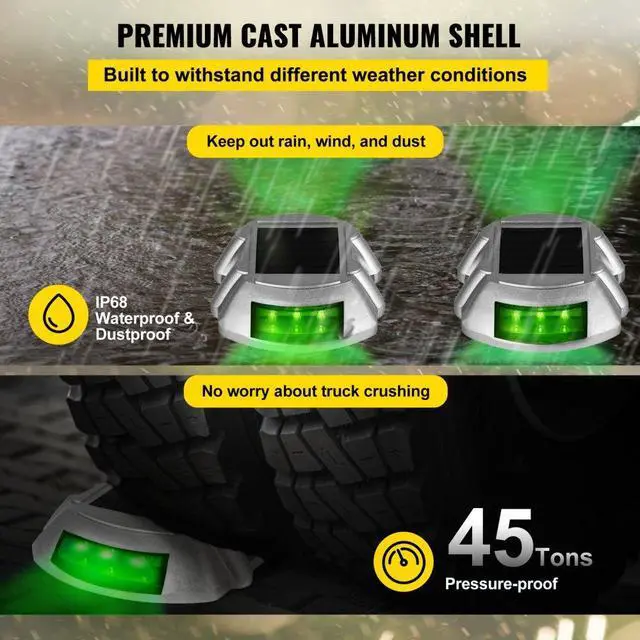 Light Color: Green,Solar Panel: Mono-Crystalline 2.5 V/120 mAh,Working Life: 3-5 years,Waterproof Rating: IP68,Load-bearing: 99208 lbs/45 tons,Bulb Type: 6pcs LEDs,Battery: 1.2 V/600 mAh Ni MH Battery,Working Temperature: -4to 158/-20 to 70,Material: Die Casting Aluminum Shell,Lighting Area: 875 yards/800 m,Item Dimension(L x W x H): 3.5 x 4 x 1 in/8.8 x 10 x 2.5 cm