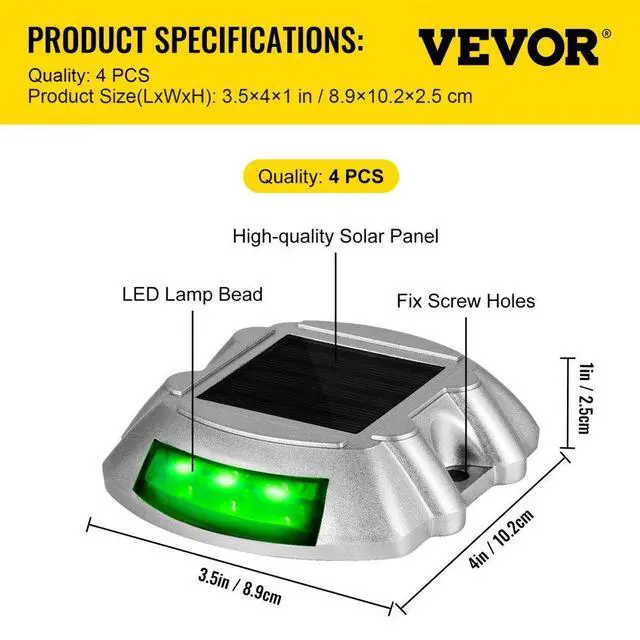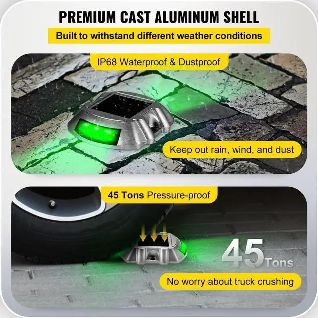 Light Color: Green,Solar Panel: Mono-Crystalline 2.5 V/120 mAh,Working Life: 3-5 years,Waterproof Rating: IP68,Load-bearing: 99208 lbs/45 tons,Bulb Type: 6pcs LEDs,Battery: 1.2 V/600 mAh Ni MH Battery,Working Temperature: -4to 158/-20 to 70,Material: Die Casting Aluminum Shell,Lighting Area: 875 yards/800 m,Item Dimension(L x W x H): 3.5 x 4 x 1 in/8.8 x 10 x 2.5 cm