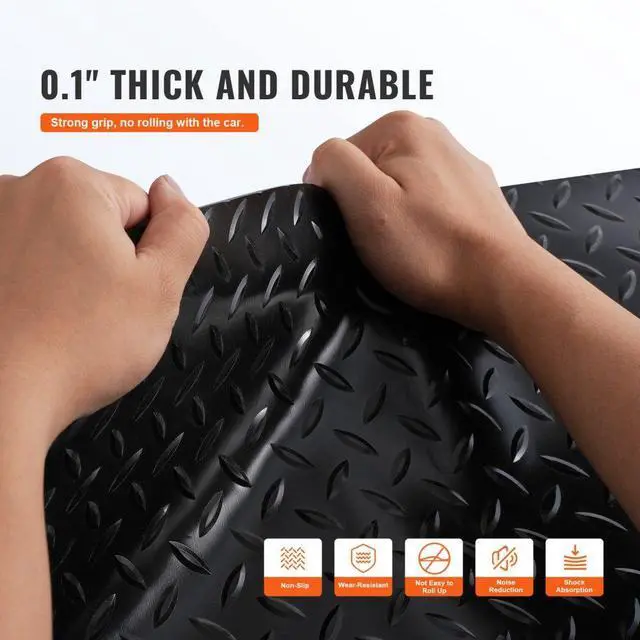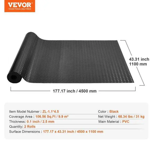 Pattern: Diamond,Mat Size: 14.7x3.6ft / 450x110cm(1 Roll),Warranty: 2 Years,Color: Black,Material: PVC Vinyl,Coverage: 105.8 sqft (2 Rolls),Tape Type: Double-Side Tape; Glass Glue,Weight: 79.4lb / 36.1kg (2 Rolls),Mat Thickness: 0.1inch / 2.5mm