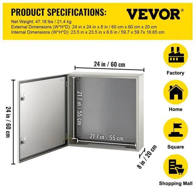 Color: Gray (RAL7032),Material: 0.059'' / 1.5 mm Carbon Steel,Outer Dimensions (W x H x D): 24'' x 24'' x 8'' / 60 x 60 x 20 cm,Feature: Lockable, Waterproof,Certification: CE / ROHS Certification,Inner Dimensions (W x H x D): 23.5'' x 23.5'' x 6.6'' / 59.7 x 59.7 x 16.65 cm,Mounting Plate: 0.079'' / 2 mm Detachable Galvanized Backplate,IP Rating: Designed to meet IP66 and NEMA 1, 2, 4, 4X, & 12 specifications,Galvanized Backplate Dimensions: 21.7" x 21.7" / 55 x 55 cm,Connection Type: Hinged,Model: SPT,Product Weight: 47.18 lbs / 21.4 kg,Coating: Epoxy Polyester Powder Coating