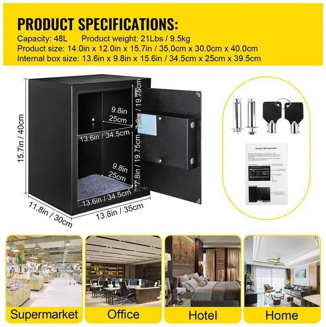 Lock Type: Key Lock/Fingerprint Lock/Digital Keypad/Fingerprint & Digital Keypad,Product Dimension: 14" x 12" x 15.7"/ 35 x 30 x 40 cm,Capacity: 1.7 Cubic Feet,Alarm: Lock & Pry-resistant Concealed Hinges,Color: Black,Load Bearing: 33 lbs / 15 kg,Material: Q235,Internal Size: 13.5" x 7.9" x 15.6" / 34.5 x 20 x 39.5 cm,Weight: 21 lbs / 9.5 kg