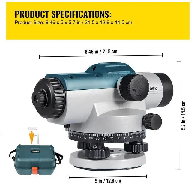 Leveling Accuracy: 1/16" at 100Ft,Measuring Range: 393 ft / 120 m,IP Rating: IP54,Model: 26X OPTICAL LEVEL,Leveling Type: Magnetic dampened compensator,Minimum Measuring Distance: 1 ft / 0.3 m,Magnification: 26X,Aperture: 40 mm,Weight: 2.35KG / 5.2LBS,Tripod Mount Thread: 5/8
