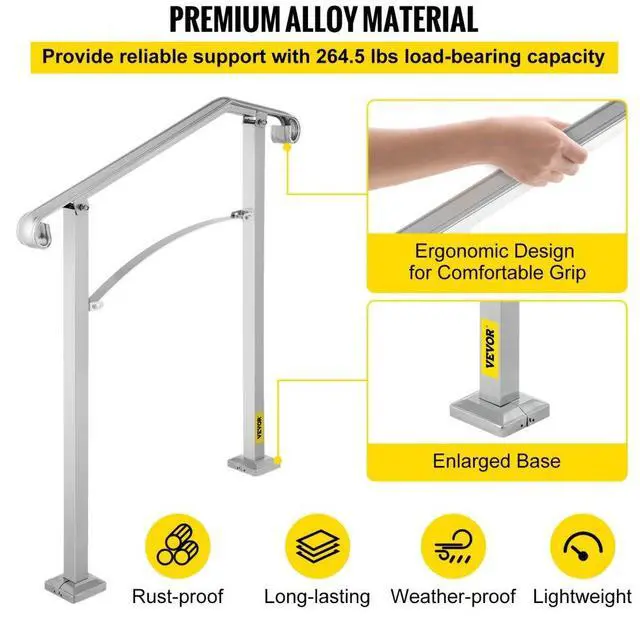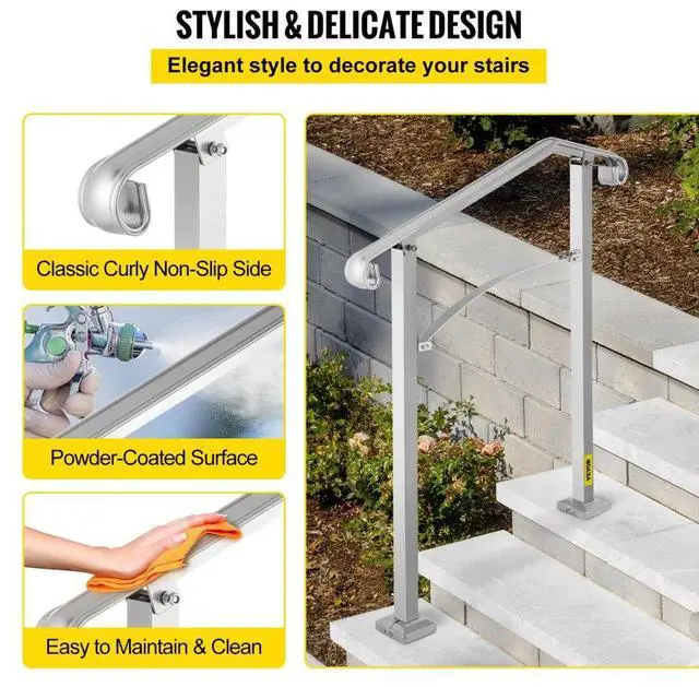 VEVOR Outdoor Stair Railing, Fit 2 or 3 Steps Alloy Metal Handrailing, Front Porch Flexible Transitional Handrail, Arch Step Rail with Installation Kit, for Concrete or Wooden Stairs, Silver