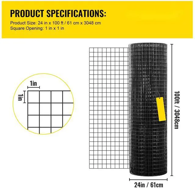 Opening: 1" Mesh,Model: VV-HC-24100,Size(L x W): 24" x 100' / 61 x 3048 cm,Material: Steel,Coating: Galvanization & Black Vinyl,Weight: 28 lbs / 12.6 kg,Wire Diameter: 16 Gauge