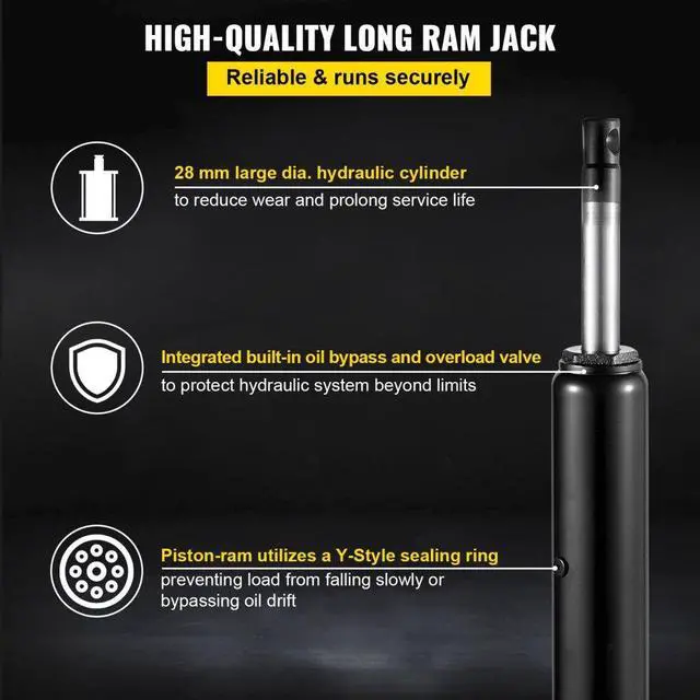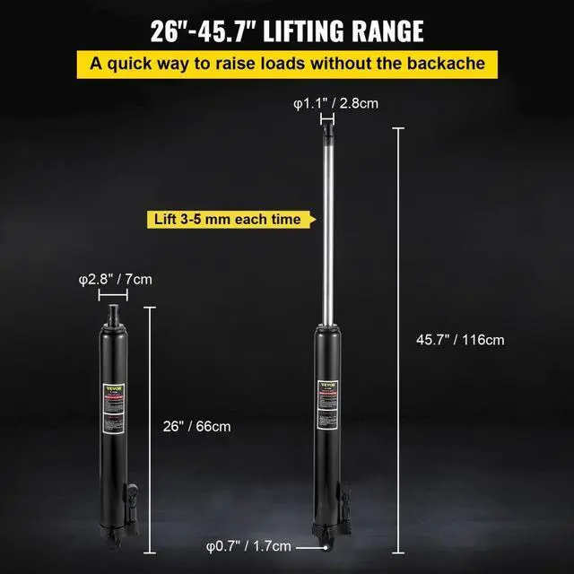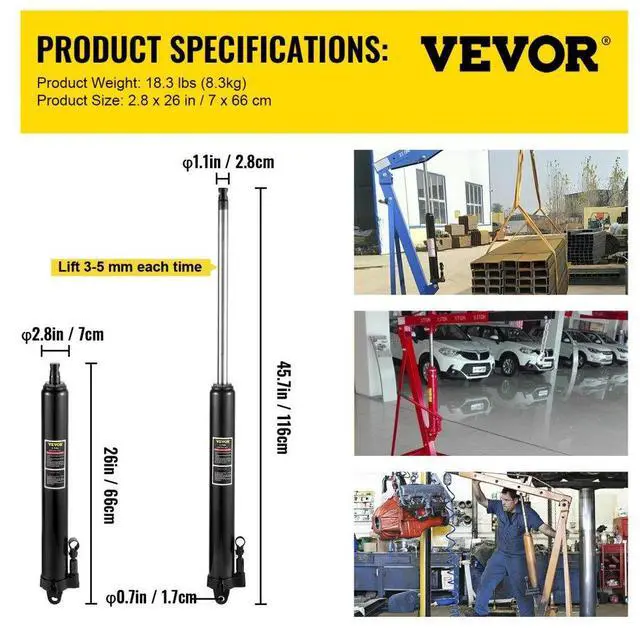 Stoke: 19.7 in/50 cm,Pinhole Dia.: 0.7 in/1.7 cm,Product Diameter: 2.8 in/ 7 cm,Lifting Capacity: 3 tons/6600 lbs,Piston Rod Dia.: 1.1 in/2.8 cm,Model: VV-CGQJD-LDJ-3T,Min. Lift Height: 26 in/66 cm,Max. Lift Height: 45.7 in/116 cm,Weight: 18.3 lb/8.3 kg