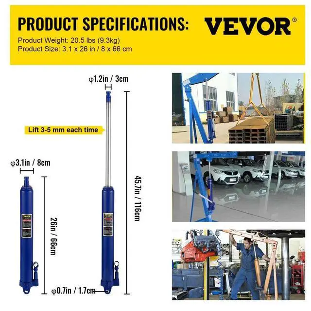 Stoke: 19.7 in/50 cm,Pinhole Dia.: 0.7 in/1.7 cm,Piston Rod Dia: 1.2 in/3 cm,Lifting Capacity: 8 Tons/17363 lbs,Model: VV-CGQJD-LDJ-8T,Min. Lift Height: 26 in/66 cm,Max. Lift Height: 45.7 in/116 cm,Drive: Hydraulic,Diameter: 3.1 in/8 cm,Weight: 20.5 lb/9.3 kg