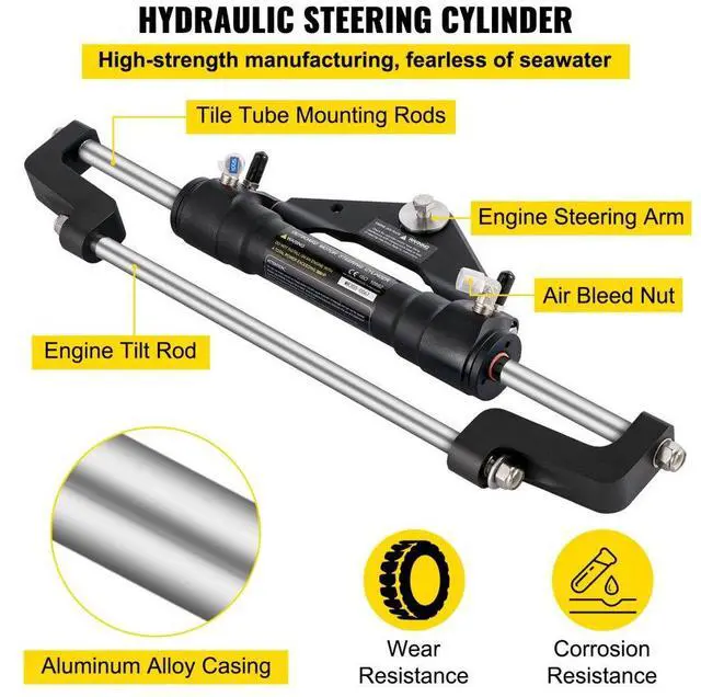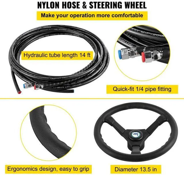 Hose Length: 14 FT,Steering Wheel Dia.: 13.5",Model: HK6314A-3 Hydraulic Outboard Boat Steering Kit,Max Pressure: 6.9 Mpa/1000psi,Output Force: 468(KGF),Material: Aluminum Alloy + PVC,Application: Up to 300HP