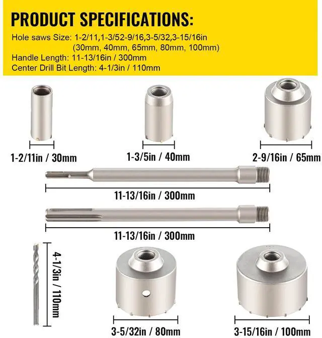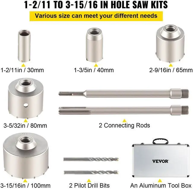VEVOR Concrete Hole Saw Kit, 1-2/11", 1-3/5", 2-9/16", 3-5/32", 3-15/16" Drill Bit Set SDS Plus & SDS MAX Shank Wall Hole Cutter w/a 4-1/3" Connecting Rod for Concrete, Cement, Stone Wall, Masonry