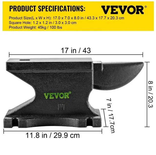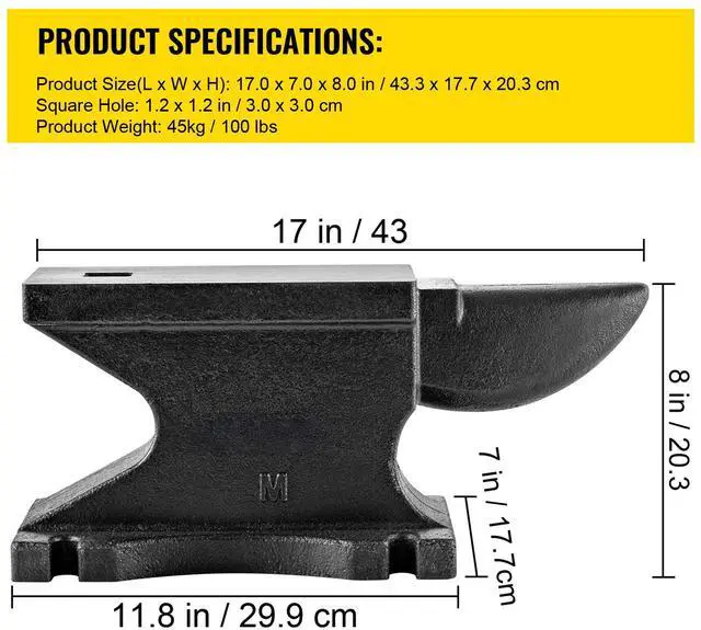 Product Size(L x W x H): 17 x 7 x 8 inch/43.3 x 17.7 x 20.3 cm,Base Size: 11.8 x 7 in/29.9 x 17.7 cm,Model: MT45,CounterTop: 10.4 x 5 in/26.5 x 12.7 cm,Hardness: 209HB,Square Hole: 1.2 x 1.2 inch/3 x 3 cm,Weight: 100 lbs/45 kg