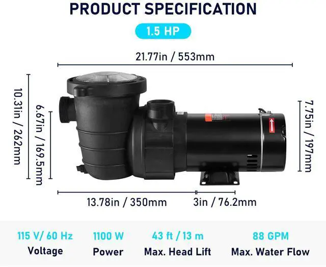 Rotating Speed: 3450 RPM,Interfaces Diameter White: 1.4",Interfaces Diameter Black: 1-1/2",Material: ABS,Power Supply: 1100 W,Amps: 9.6 A,Power Cord Length: 78.7"/ 2 m,Max. Head Lift: 43 ft/ 13 m,Horse Power: 1.5 HP,Max. Flow Rate: 333L per min./ 88 GPM,Voltage: 115 V/ 60 Hz,Model: VVPS115BUS,Water Temperature: 0-40/ 32-104 F