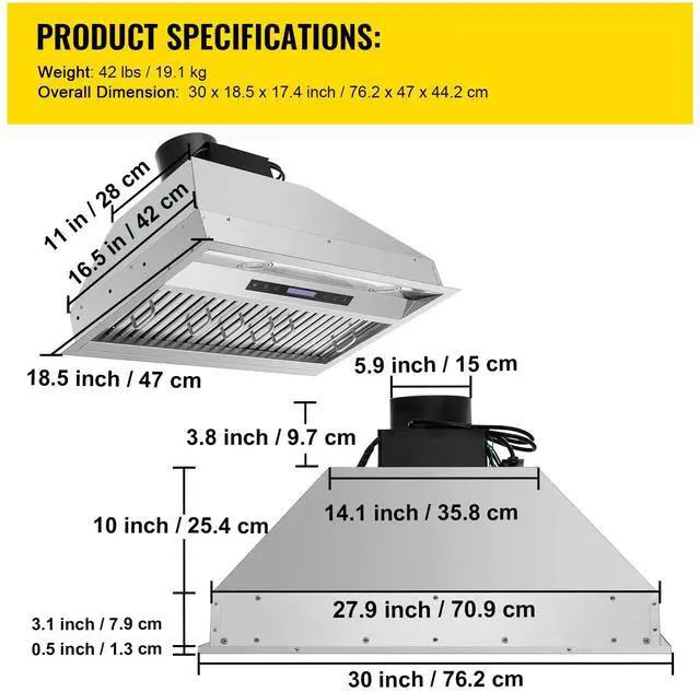 Noise Level: 62dB,Body Material: 201 Stainless Steel,Control Type: Touch & Remote Control,Speeds: 200/450/700/900 CFM,Model: E70-30-SS,Delayed Shut Off: 1-15 min,LED Light Power: 3W,Product Weight: 42 lbs / 19.1 kg,Motor Power: 135W,Product Dimensions: 30 x 18.5 x 17.4 inch / 76.2 x 47 x 44.2 cm,Duct Length: 59.1 inch / 1.5 m