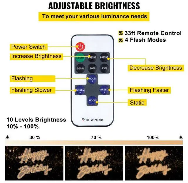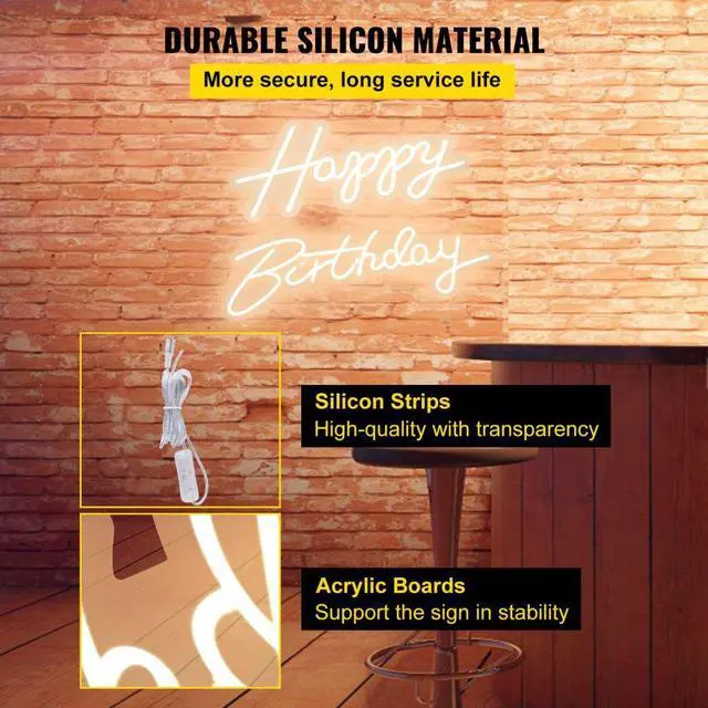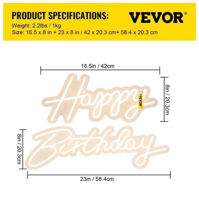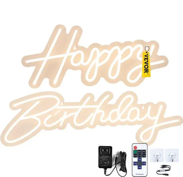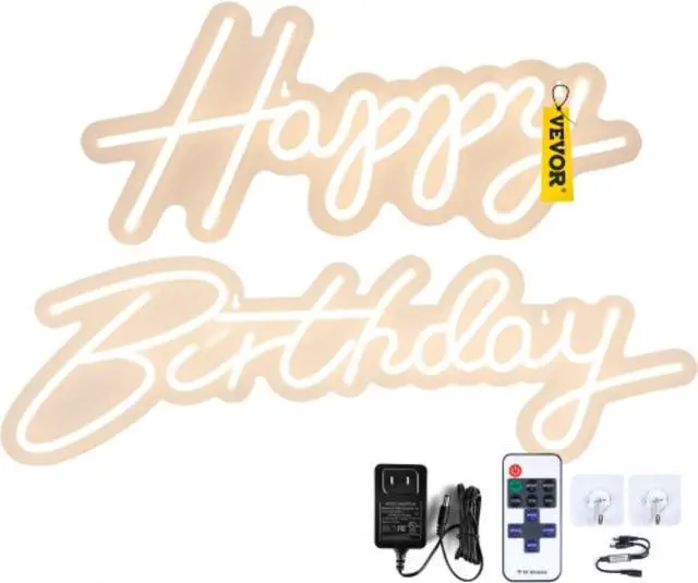 VEVOR Happy Birthday Neon Sign, 16.5" x 8" + 23" x 8" LED Neon Lights Signs, Adjustable Brightness w/ Remote Control and Power Adapter, Reusable for Party, Club, Celebration and Decoration Warm White