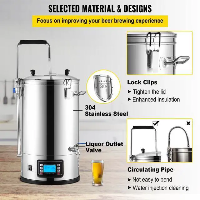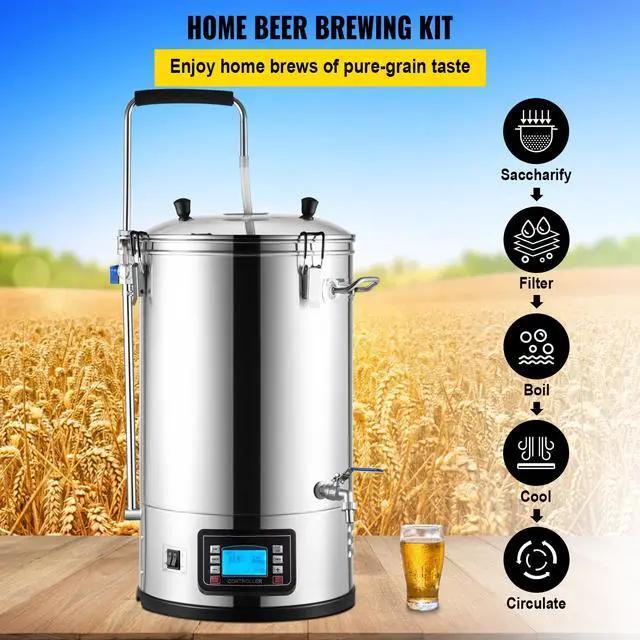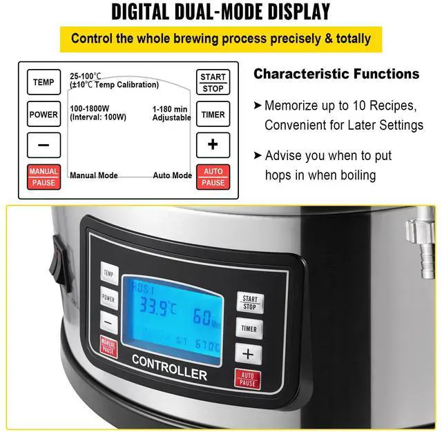 VEVOR Electric Brewing System, 9.2 Gal/35 L Brewing Pot, All-in-One Home Beer Brewer w/Pump, Mash Boil Device w/Panel, Auto/Manual Mode 100-1800W Power 25-100 Temp 1-180 min Timer Recipe Memory