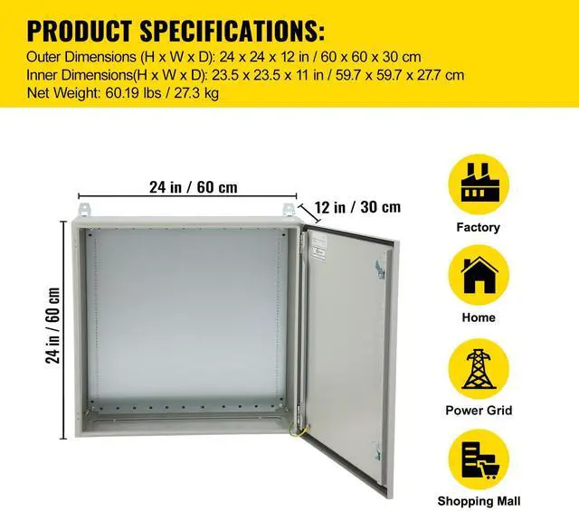 VEVOR Electrical Enclosure, 24'' x 24'' x 12'', UL Certified NEMA 4 Outdoor Enclosure, IP65 Waterproof & Dustproof Cold-Rolled Carbon Steel Hinged Junction Box for Outdoor Indoor Use, with Rain Hood