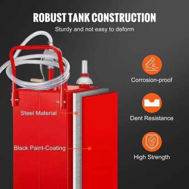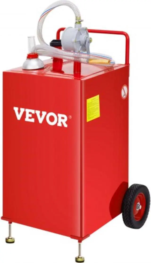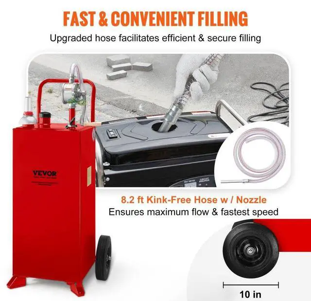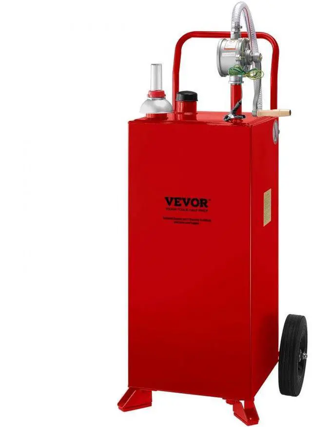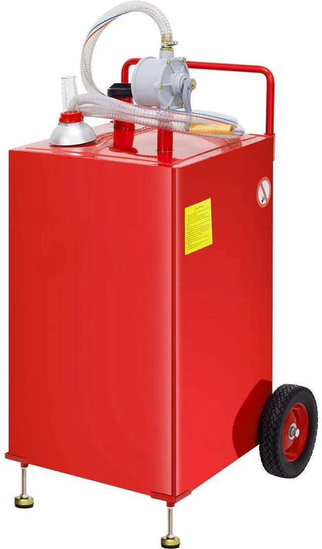 Tank Size: 37.8 x 20.9 x 20.9 in/ 96 x 53 x 53 cm,Hose Length: 9.8 ft/ 3 m,Product Color: Red,Model: 30 Gallon Fuel Caddy,Material: 201 Stainless Steel,Tire Diameter: 8 in/ 20.3 cm,Fuel Type: Gasoline, Diesel, Kerosene,Pump Type: Two Way Rotary Pump