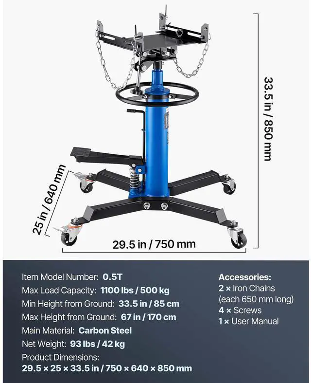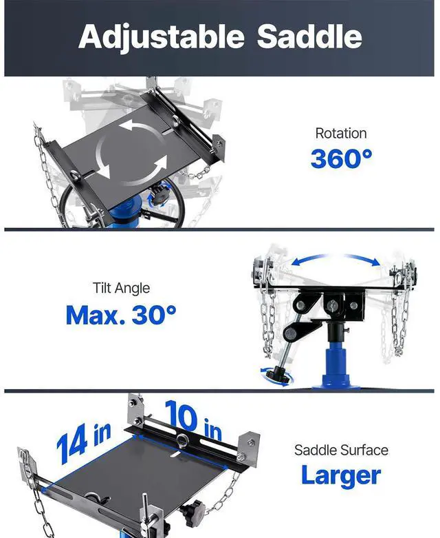 Tray Size:13.8" x 9.8"/35 x 25 cm,Saddle Rotation: 360,Product Dimension: 33.5" x 25.6" x 33.5"/85 x 65 x 85 cm,Load Capacity: 1100 lbs / 0.5 ton,Color: Blue,Model: 1100BLUEJACK,Saddle Tilt: 30,Material: Steel,Safety Chain Length: 23-3/5"/ 60 cm,Net Weight: 95.9 lb/43.5 kg,Lift Range: 33-1/2" -67"/ 85-170 cm