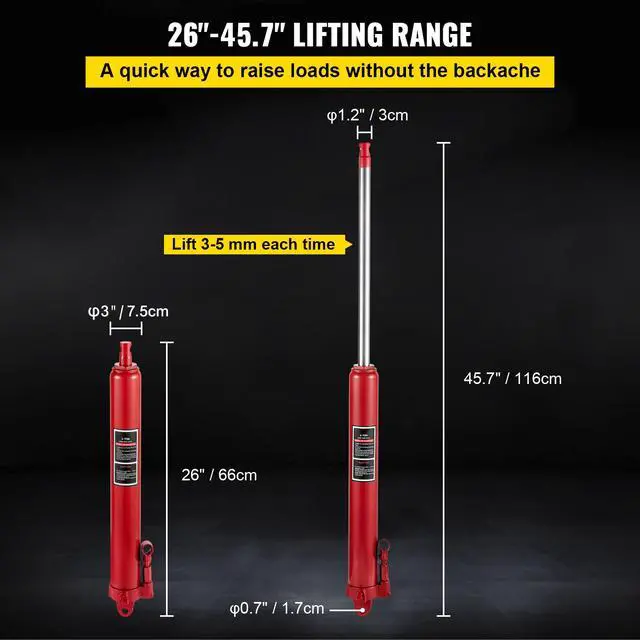Stoke: 19.7 in/50 cm,Pinhole Diameter: 0.7 in/1.7 cm,Product Diameter: 3.1 in/8 cm,Piston Rod Diameter: 1.2 in/3 cm,Lifting Capacity: 8 Tons/17363 lbs,Model: VV-CGQJD-HODJ-8T,Min. Lift Height: 26 in/66 cm,Max. Lift Height: 45.7 in/116 cm,Power: Hydraulic,Weight: 20.5 lb/9.3 kg