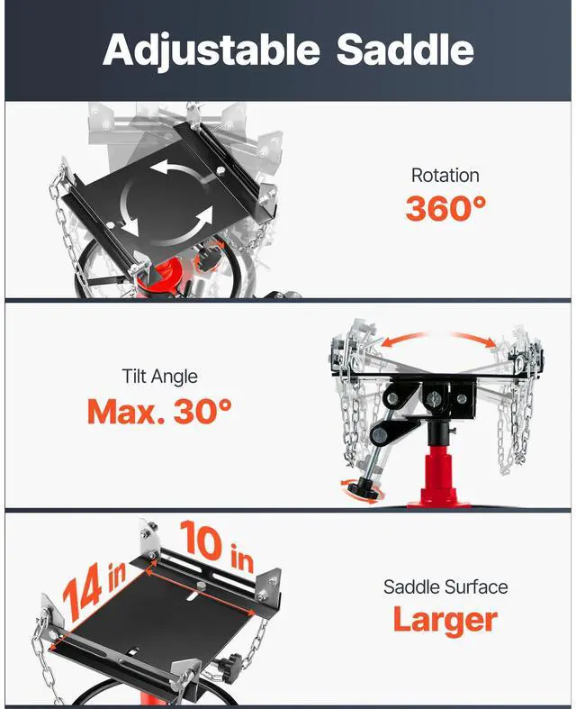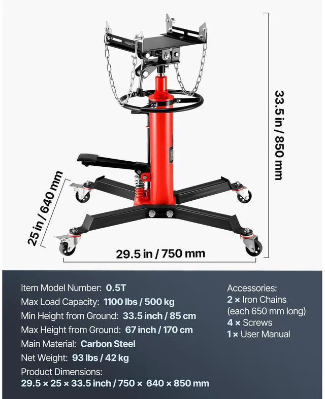 Tray Size:13.8" x 9.8"/35 x 25 cm,Saddle Rotation: 360,Product Dimension: 33.5" x 25.6" x 33.5"/85 x 65 x 85 cm,Load Capacity: 1110 lbs / 1/2 ton,Color: Red,Model: 1100REDJACK,Saddle Tilt: 30,Material: Steel,Safety Chain Length: 23-3/5"/ 60 cm,Net Weight: 95.9 lb/43.5 kg,Lift Range: 33-1/2" -67"/ 85-170 cm