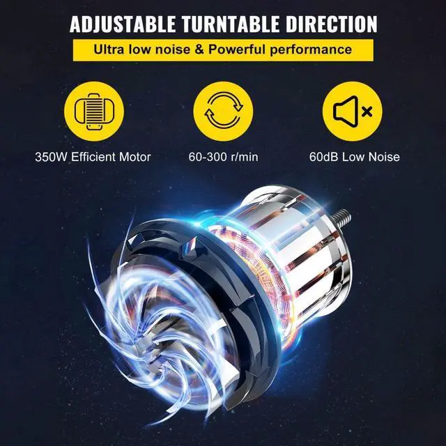 Product Dimension (L x W x H): 25 x 16 x 16 in / 65 x 42 x 42 cm,Speed: 0-300 rpm,Pedal Cable Length: 70.8 in / 1.8 m,Retractable Table Range: 0-7.8 in / 0-20 cm,Turntable Material: Aluminum Alloy,Turntable Size: 11 in / 28 cm,Voltage: 110V,Direction of Rotation: Clockwise & Counterclockwise,Model: GCJX-008,Working Noise: 60dB,Power: 450W,Weight: 44 lbs / 20 kg