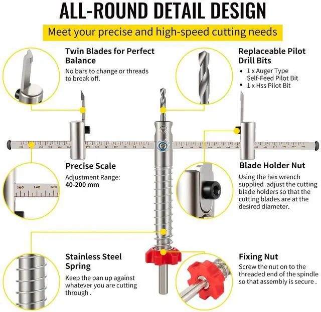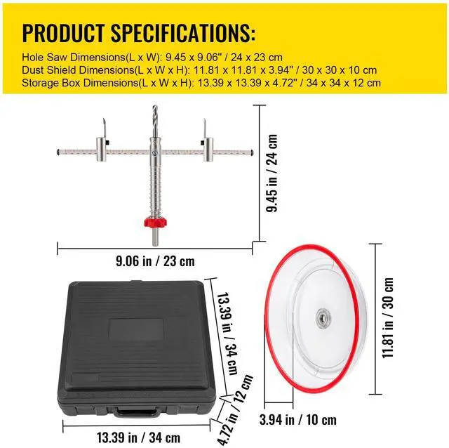 Dust Shield Material: PC,Storage Box Dimensions(L x W x H): 13.39 x 13.39 x 4.72'' / 34 x 34 x 12 cm,Cutting Hole Diameter: 1-5/8" to 8" / 40 mm to 200 mm,Cutting Depth: 1-1/8" / 30 mm,Model: FJKKQ-40-200,Drill Bits Size: 5/32'', 3/16'',1/4'', 5/16'', 3/8''(4, 5, 6, 8, 10 mm),Dust Shield Dimensions(L x W x H): 11.81 x 11.81 x 3.94'' / 30 x 30 x 10 cm,Dust Shield Bearing Type: 6203Z Ball Bearing,Pilot Bit Material: Steel,Storage Box Material: HDPE,Hole Saw Dimensions(L x W): 9.45 x 9.06'' / 24 x 23 cm,Cutting Blades Material: Steel