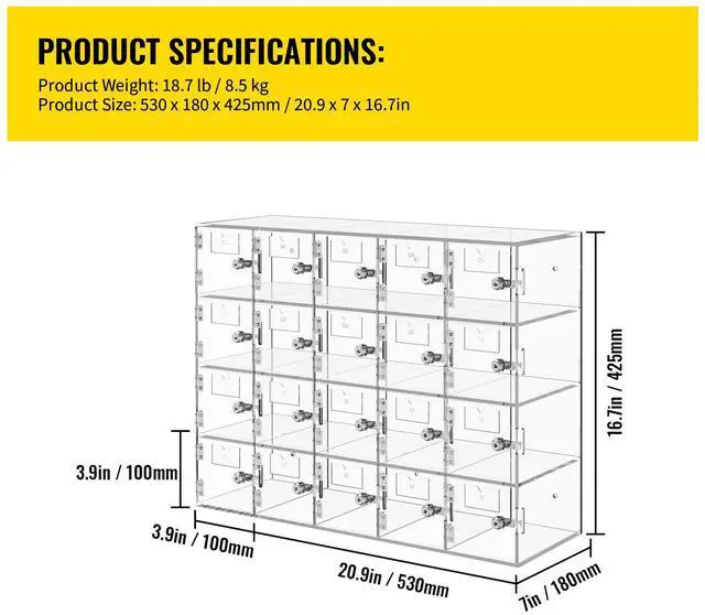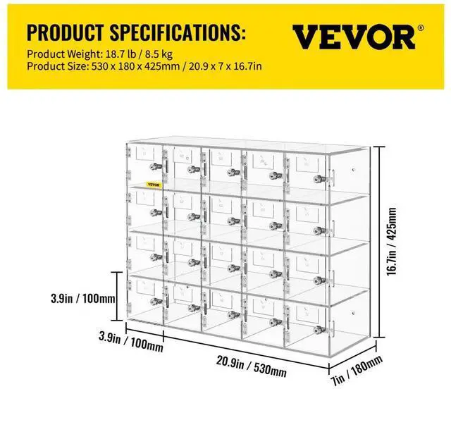 Installation Method: Screw-In,Each Slot Size: 3.9 x 7 x 3.9 in/10 x 18 x 10 cm,Load-bearing Capacity: 20 kg/44 lbs,Shape: Rectangular,Gross Weight: 18.7 lb/8.5 kg,Material of Lock: Stainless Steel,Numbers of Slots: 20,Color: Clear,Model: SJG-YKL-20M,Material: Acrylic,Mounting Type: Wall Mount, Freestanding,Product Size: 20.9 x 7 x 16.7 in/53 x 18 x 42.5 cm