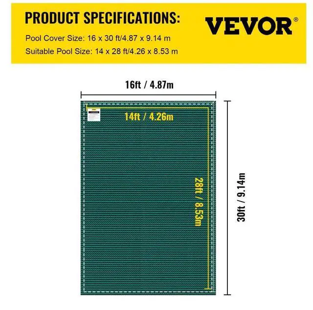 Ground Bolt: Brass,Gross Weight: 40.8 lb/18.5 kg,Tension Spring: 304 stainless steel,Swimming Pool Size: 14 x 28 ft/4.26 x 8.53 m,Color: Green,Model: YYCM-6698,Swimming Pool Cover Size: 16 x 30 ft/4.87 x 9.14 m,Material: Polypropylene,Surface: Tight Mesh