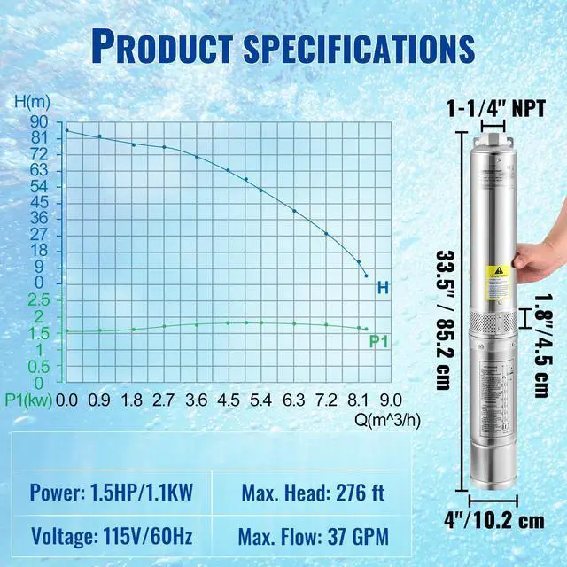 Max. Speed: 3450 r/min,Max. Head: 276 ft/84 m,Pump Diameter: 4"/10.2 cm,Waterproof Grade: IP68,Electric Cord Length: 33 ft/10 m,Material: Stainless Steel,Discharge Size: 1-1/4" NPT (3.2 cm NPT),Insulation Class: F,Sand Resistant: <5%,Work Temperature: 32-104/0-40,Certification: ETL,Impeller Stages: 8,Max. Flow: 37GPM (140L/min),Voltage: 115V/60Hz,Model: 4SSM5/8,Power: 1.5HP/1100W