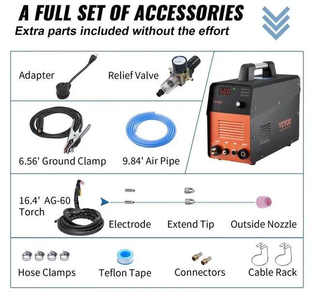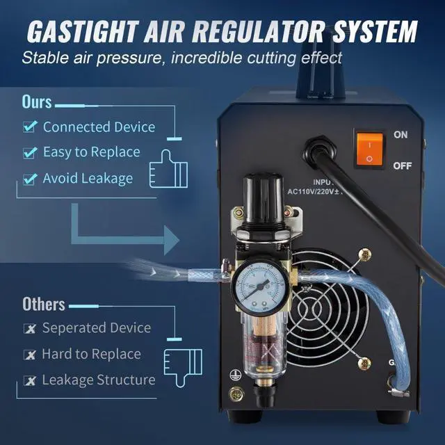 Arc Striking: HF Pilot Arc,Enclosure Protection Level: IP21S,Maximum Severance Cut: 5/8"/16 mm,Item Size: 14.2" x 5.9" x 11.8"/36 x 15 x 30 cm,Output Current: 110V: 20-40A; 220V: 20-50A,Access Air Pressure: Less than 0.8Mpa,Input Voltage: AC110/220V10%,Cutting Material: Aluminum, Stainless Steel, Mild Steel, Copper,Open Circuit Losses: 220V 14W; 110V 56W,Operating Air Pressure: Less than 0.5MPa,Efficiency: 0.86,Model: VV-PC-CUT50P,Insulation Grade: F,Duty Cycle: 30%@104 F, 50A60%@104 F, 33A100%@104 F, 25A,Power Factor: 0.8,Item Weight: 23lb/10.4 kg,Ideal Clean Cut: 1/2"/12 mm