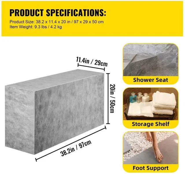 VEVOR Tile Shower Seat, 38.2" x 11.4" x 20" Tile Shower Seat, Factory Waterproof & 100% Leak-Proof Tileable Shower Corner Seat, 440lbs Loading Rectangular Board Shower Bench, Grey